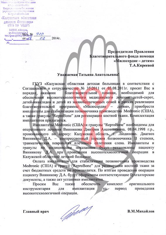 Главный врач Калужской областной детской больницы В.М.Михайлов обратился с просьбой о помощи в обеспечении операции по установке имплантатов стабилизации позвоночника Medtronic (США). Стоимость проведения операции, необходимого медикаментозного обеспечения и последующей реабилитации оплачивается за счет бюджетных средств. К сожалению, бюджетом не оплачивается стоимость имплантатов и гранул для регенерации костной ткани, поэтому Дмитрий будет прооперирован под гарантии оплаты фондом имплантатов и расходных материалов.