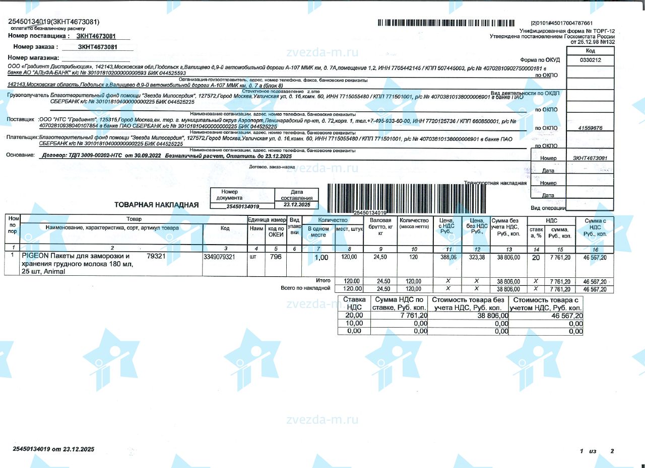 - Пакеты одноразовые для хранения грудного молока Pigeon – 1 упаковка (25шт.)