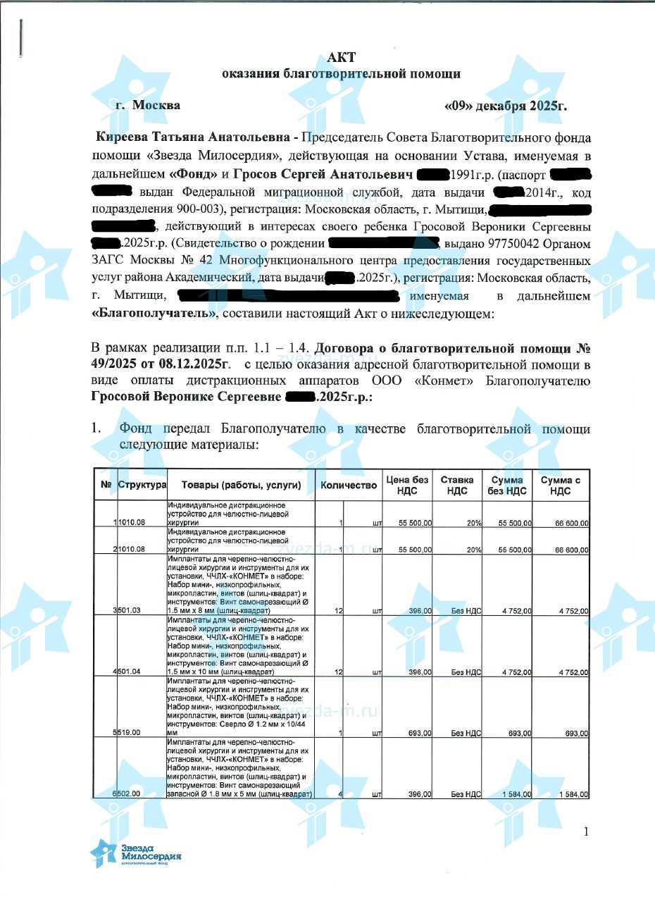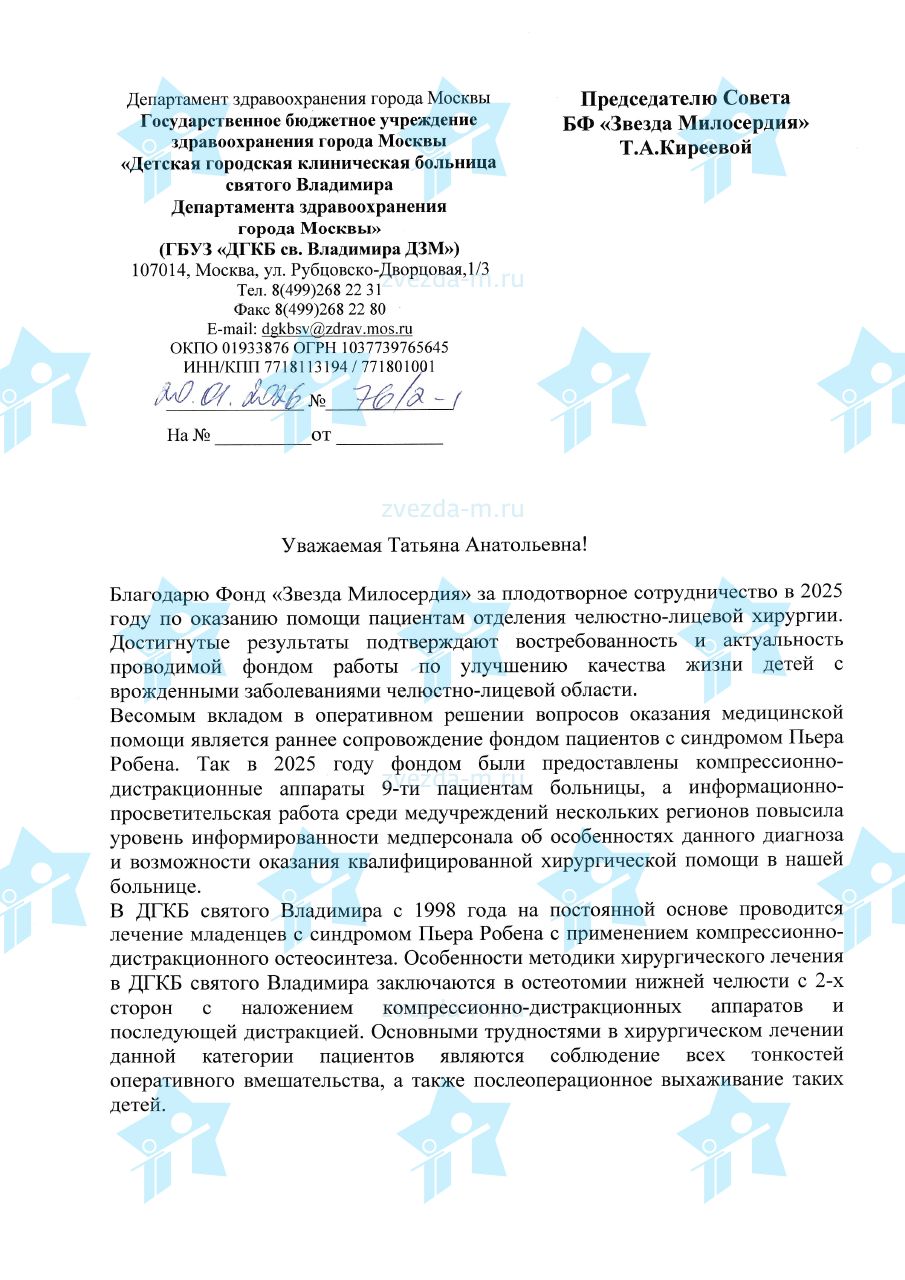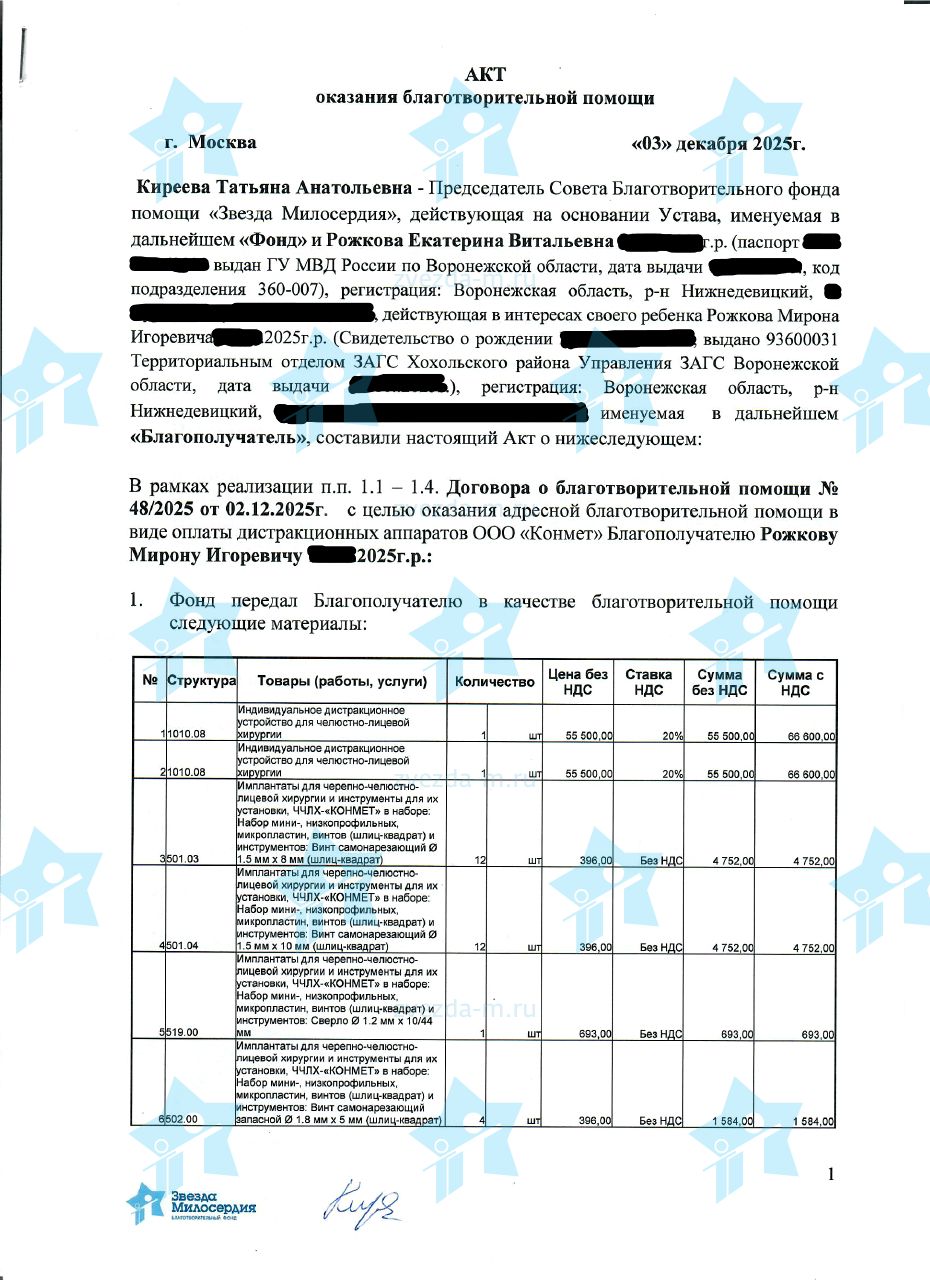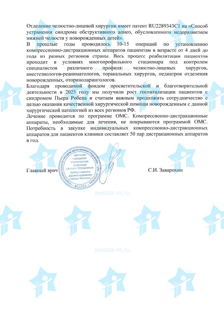 Лечение детей с синдромом Пьера Робена проводится по программе ОМС. Компресионно-дистракционные аппараты, необходимые для лечения, не покрываются программой ОМС. Стоимость одного комплекта производства Конмет (РФ) в 2026 году составляет 149 559 рублей. Необходимо собрать 8 973 300 рублей, чтобы фонд мог поэтапно оплачивать изготовление дистракторов и оказать помощь 60 подопечным с синдромом Пьера Робена в клиниках-партнерах. 10 наших новорожденных подопечных уже получили помощь фонда в обеспечении жизненно важной хирургической операции по установке компрессионно-дистракционного аппарата. Документы с указанием подопечных, получивших помощь, размещаются на этой странице по мере проведения операций и завершения этапа реабилитации.