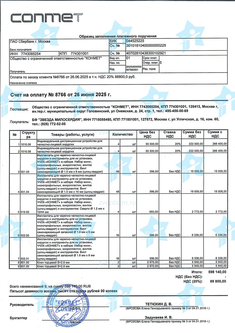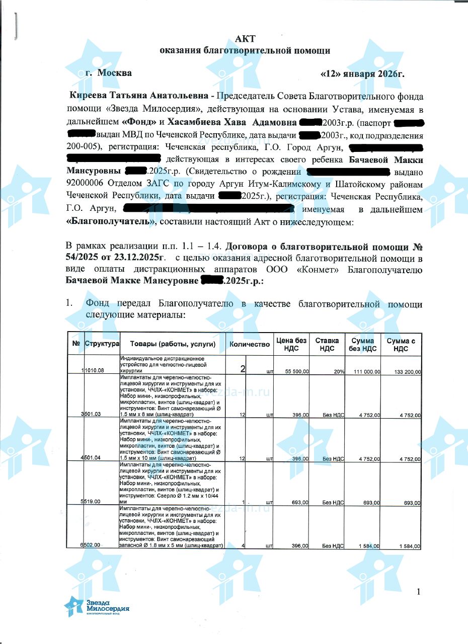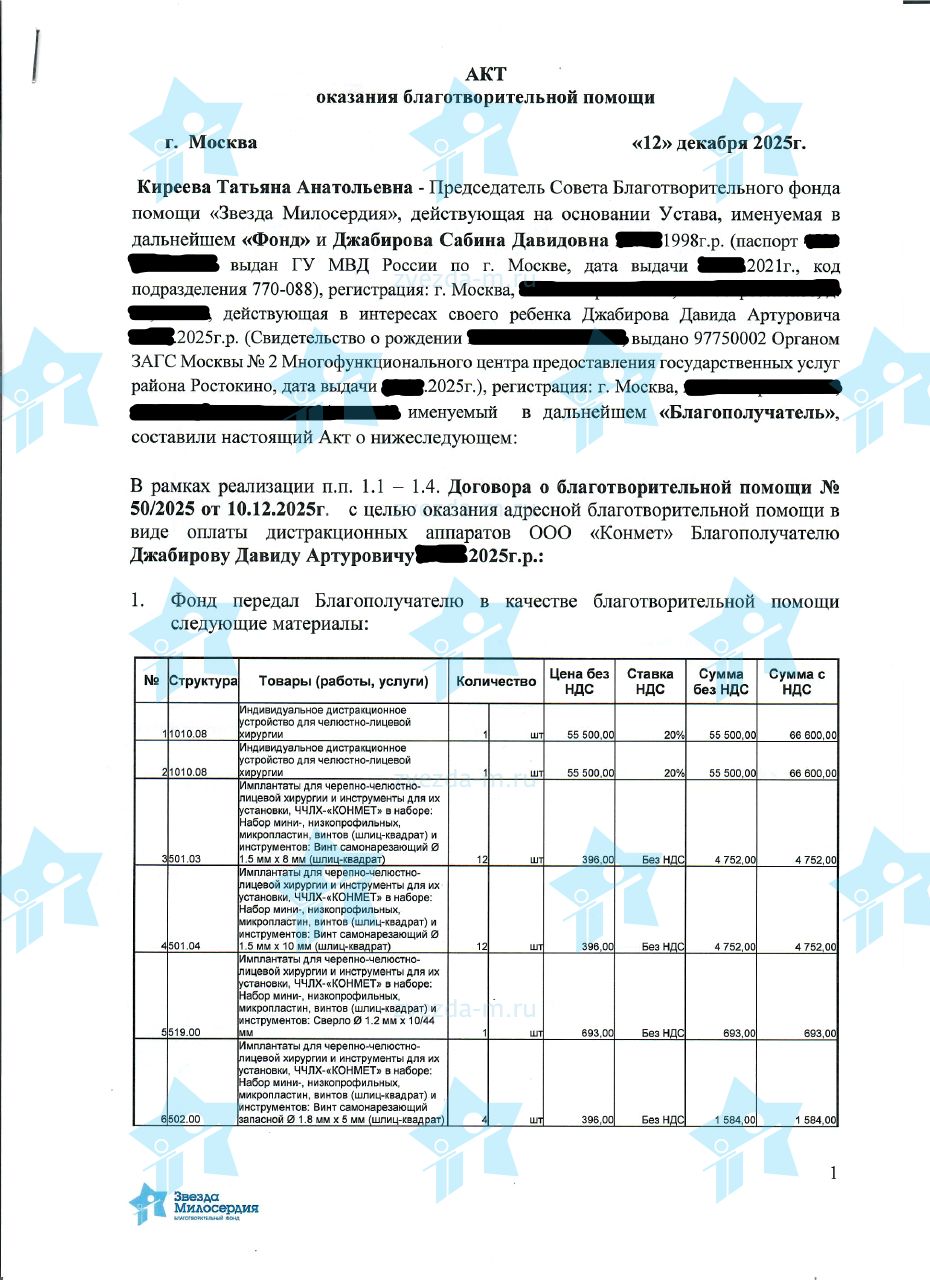 Лечение детей с синдромом Пьера Робена проводится по программе ОМС. Компресионно-дистракционные аппараты, необходимые для лечения, не покрываются программой ОМС. Стоимость одного комплекта производства Конмет (РФ) в 2026 году составляет 149 559 рублей. Необходимо собрать 8 973 300 рублей, чтобы фонд мог поэтапно оплачивать изготовление дистракторов и оказать помощь 60 подопечным с синдромом Пьера Робена в клиниках-партнерах. 10 наших новорожденных подопечных уже получили помощь фонда в обеспечении жизненно важной хирургической операции по установке компрессионно-дистракционного аппарата. Документы с указанием подопечных, получивших помощь, размещаются на этой странице по мере проведения операций и завершения этапа реабилитации.