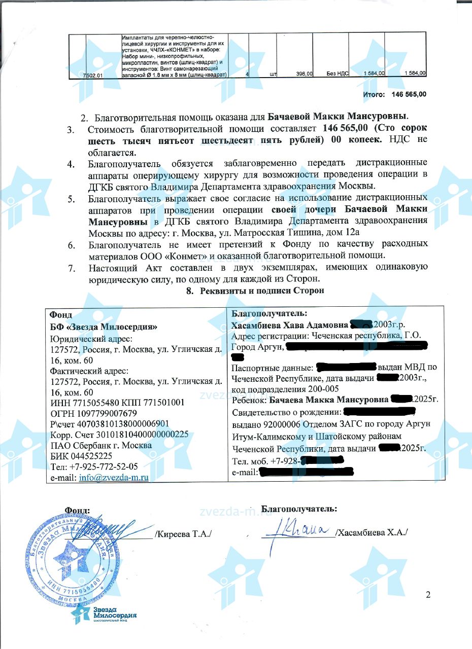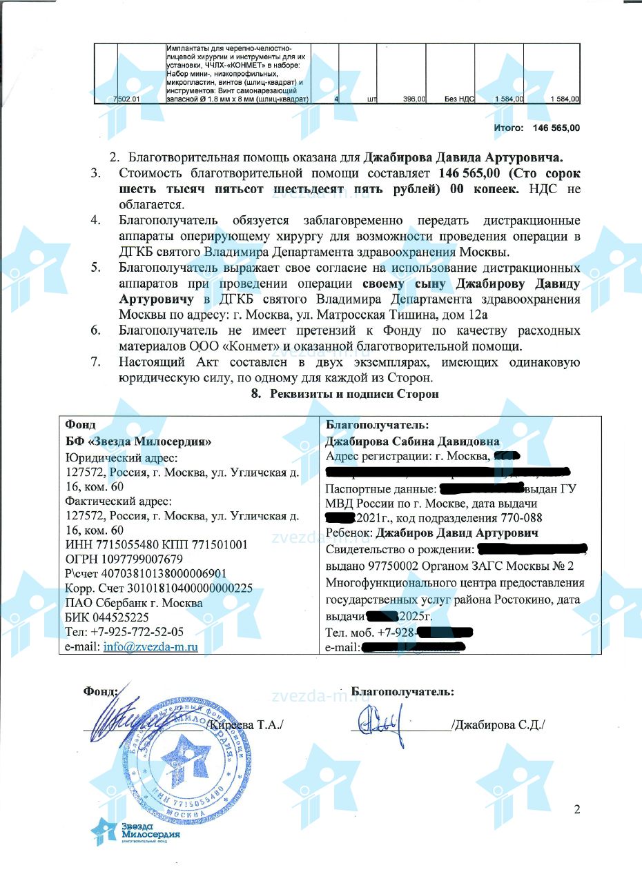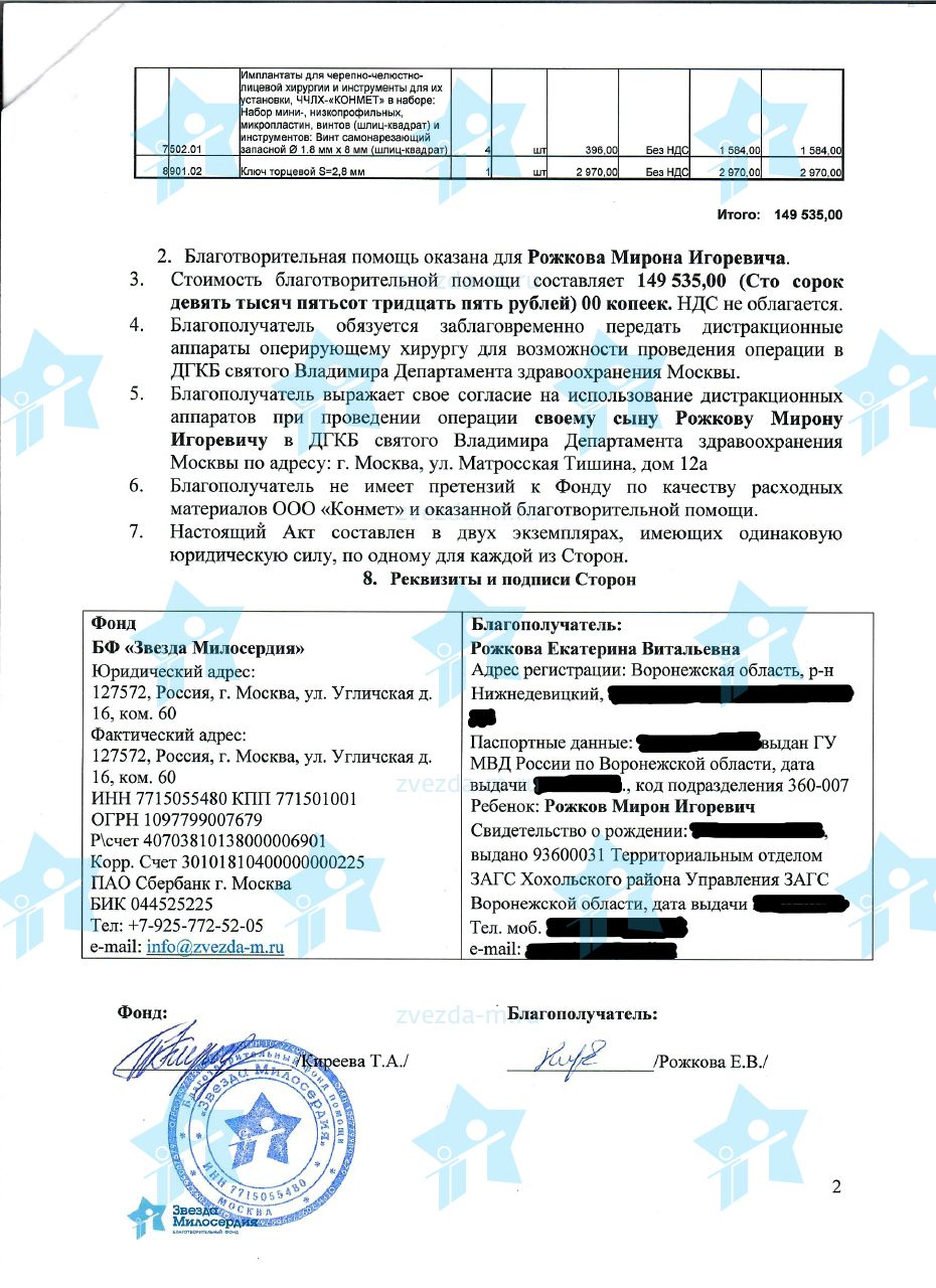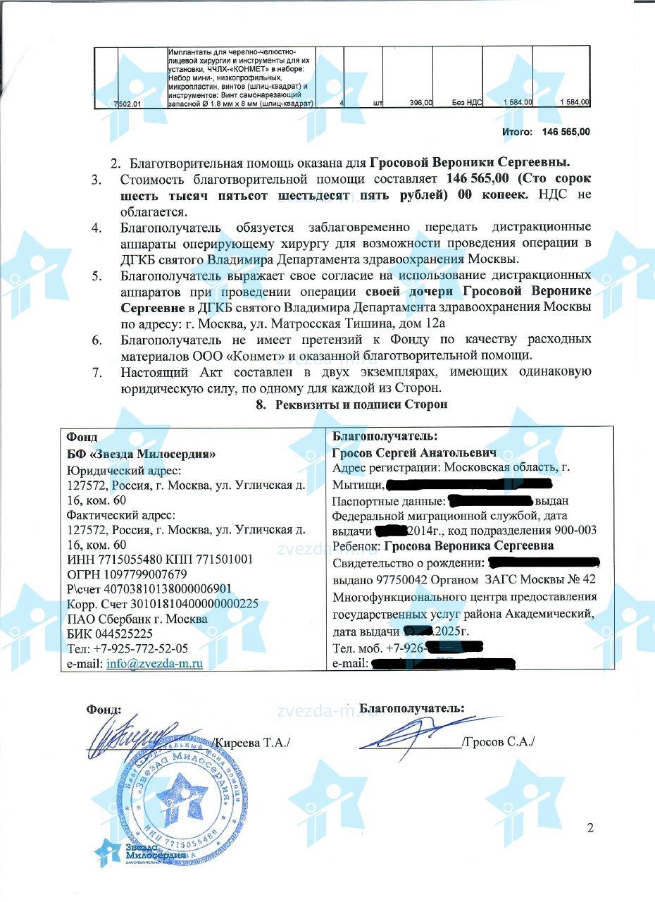 Мы обратились к Татьяне Анатольевне Киреевой, руководителю фонда «Звезда Милосердия». Оказалось, что у фонда уже заказаны дистракторы и их скоро поставят, не придется держать ребенка на аппаратах еще два месяца. Собрали все документы, и стали ждать. И спасибо огромное фонду, что все прошло оперативно.