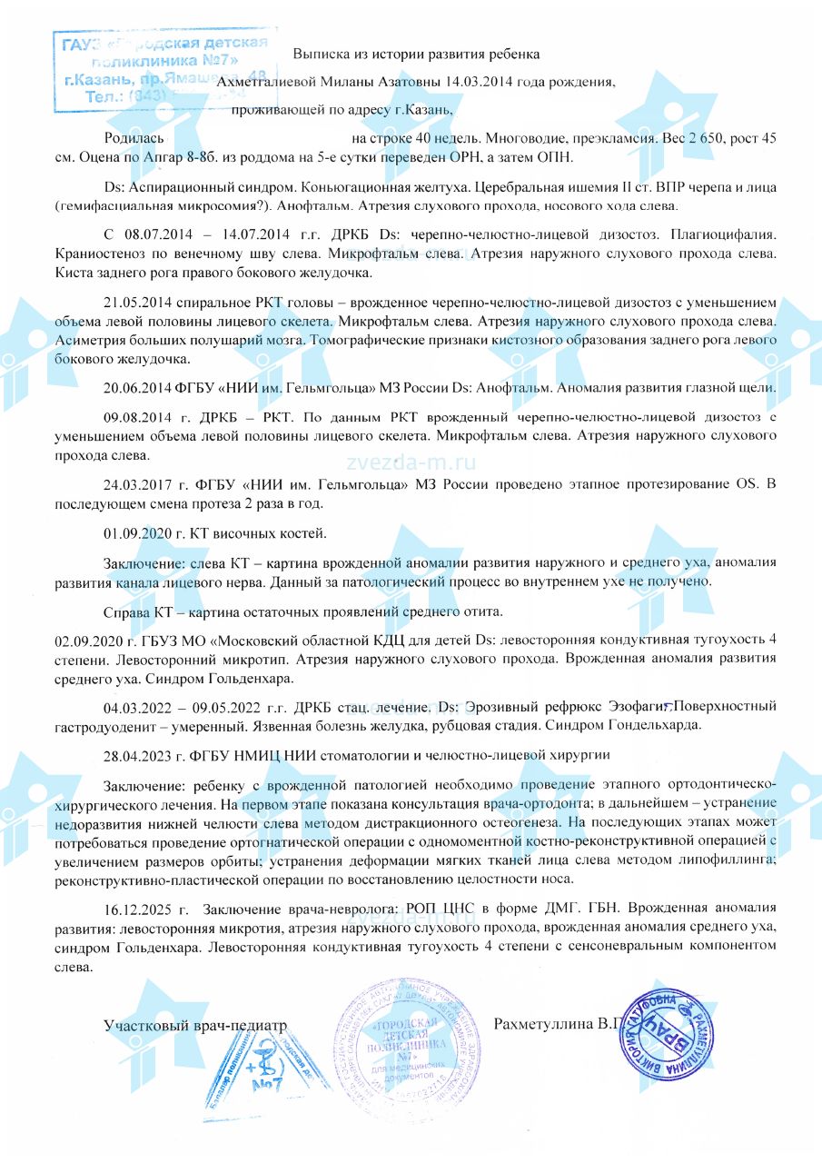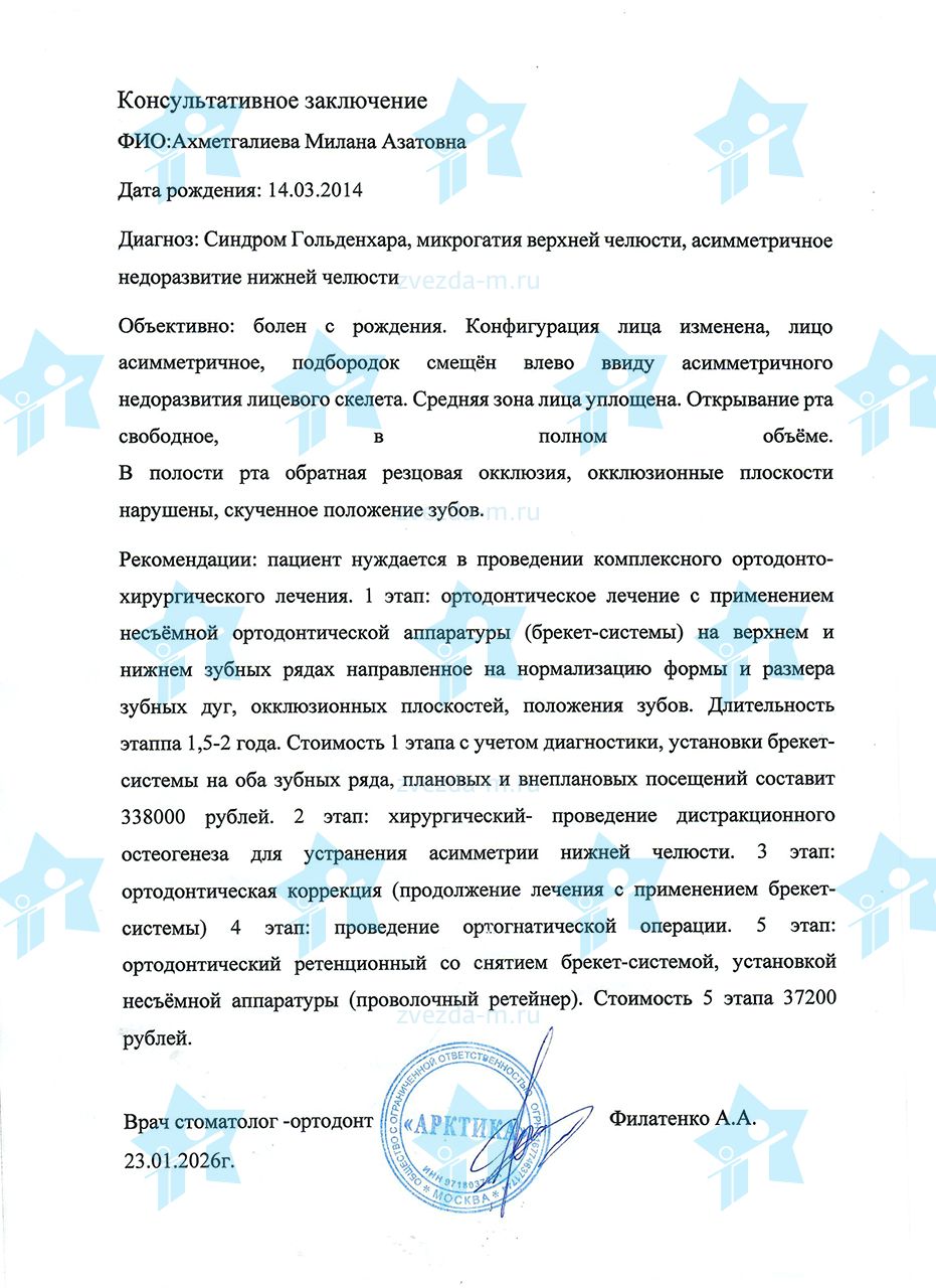Милане 12 лет, она из Казани. Диагноз – синдром Гольденхара, микрогнатия верхней челюсти, асимметричное недоразвитие нижней челюсти. Больна с рождения, в 2017 году проведено протезирование глаза. Милане необходимо пройти комплексное многоэтапное ортодонто-хирургическое лечение: устранение недоразвития нижней челюсти слева методом дистракционного остеосинтеза, костно-реконструктивную операцию с увеличением размеров орбиты, липофиллинг и реконструктивно-пластическую операцию по восстановлению целостности носа. В сумму сбора входят два этапа ортодонтического лечения с расходными материалами, диагностические процедуры. Главный врач клиники ООО «Арктика» О.Т. Зангиева и мама девочки обратились в фонд за помощью.