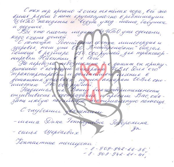 Стабильно-тяжелое состояние больного и отсутствие необходимости в специализированной медицинской помощи позволяют ему находиться в домашних условиях, однако для этого необходимы портативный аппарат искусственной вентиляции легких Carina (Draeger – Германия), многофункциональная медицинская кровать и мощный бензогенератор для резервного электропитания. Их оплата за счет бюджетных средств не производится. Семья Никиты не в состоянии самостоятельно его приобрести. Мама Никиты получает зарплату менее 10 000 рублей в месяц. Родной отец мальчика покинул семью и не оказывает финансовой помощи, отчим в настоящее время не работает.